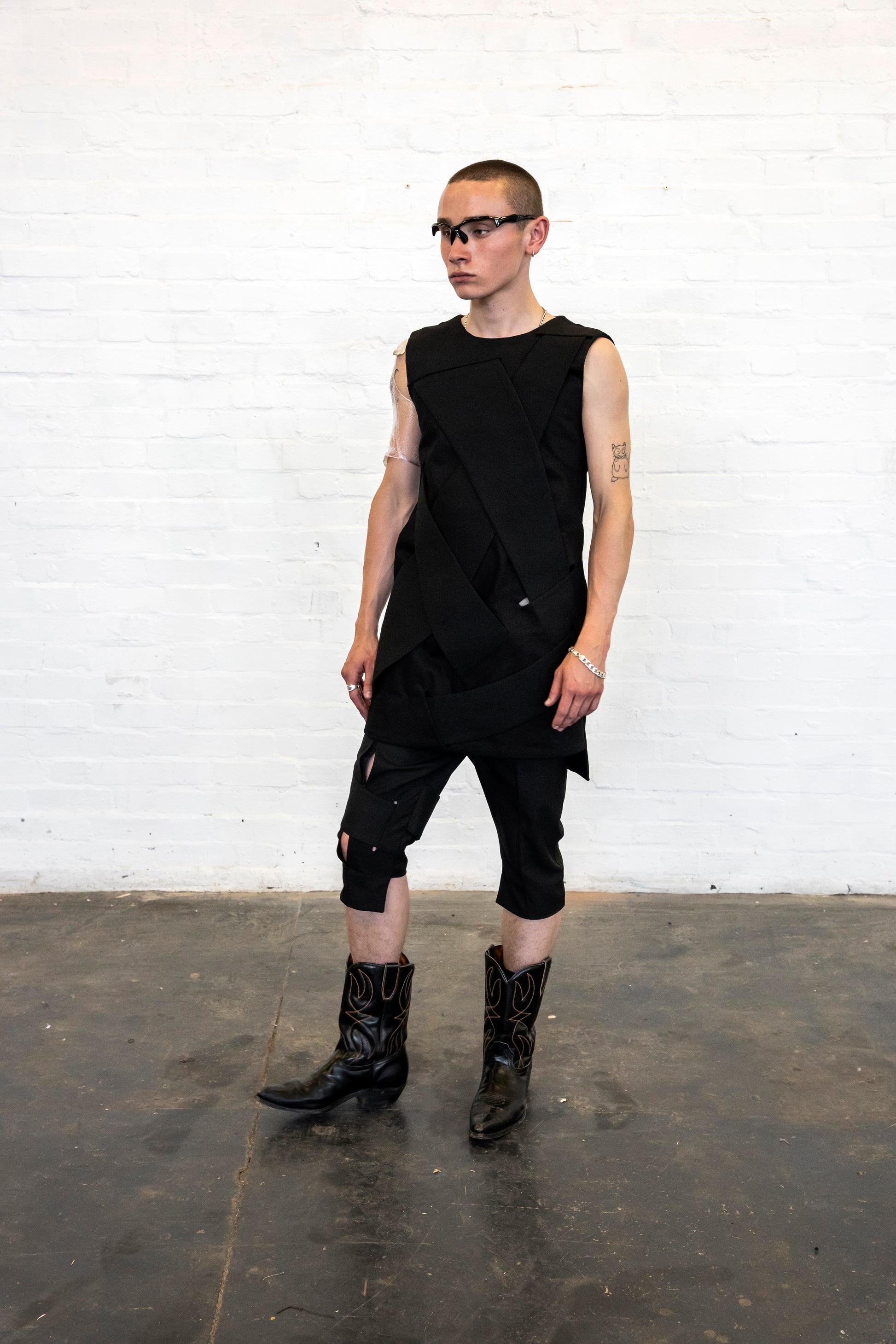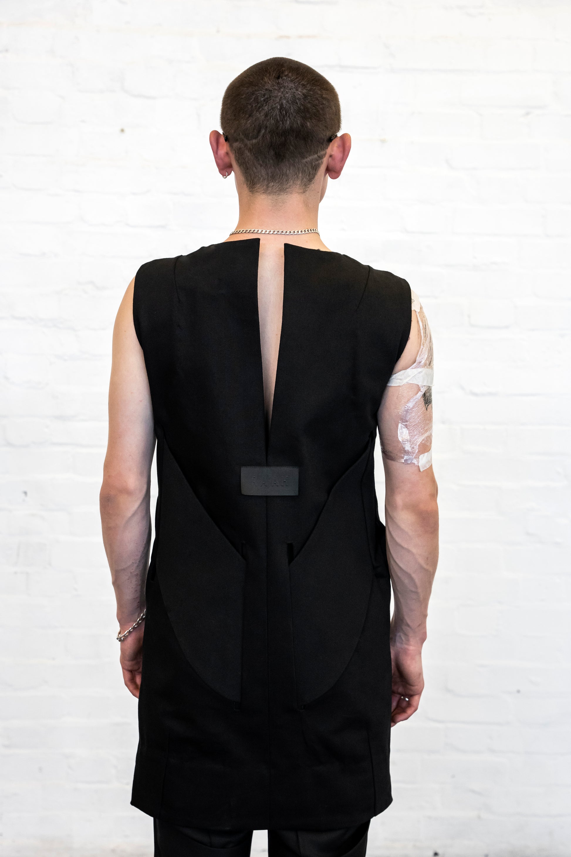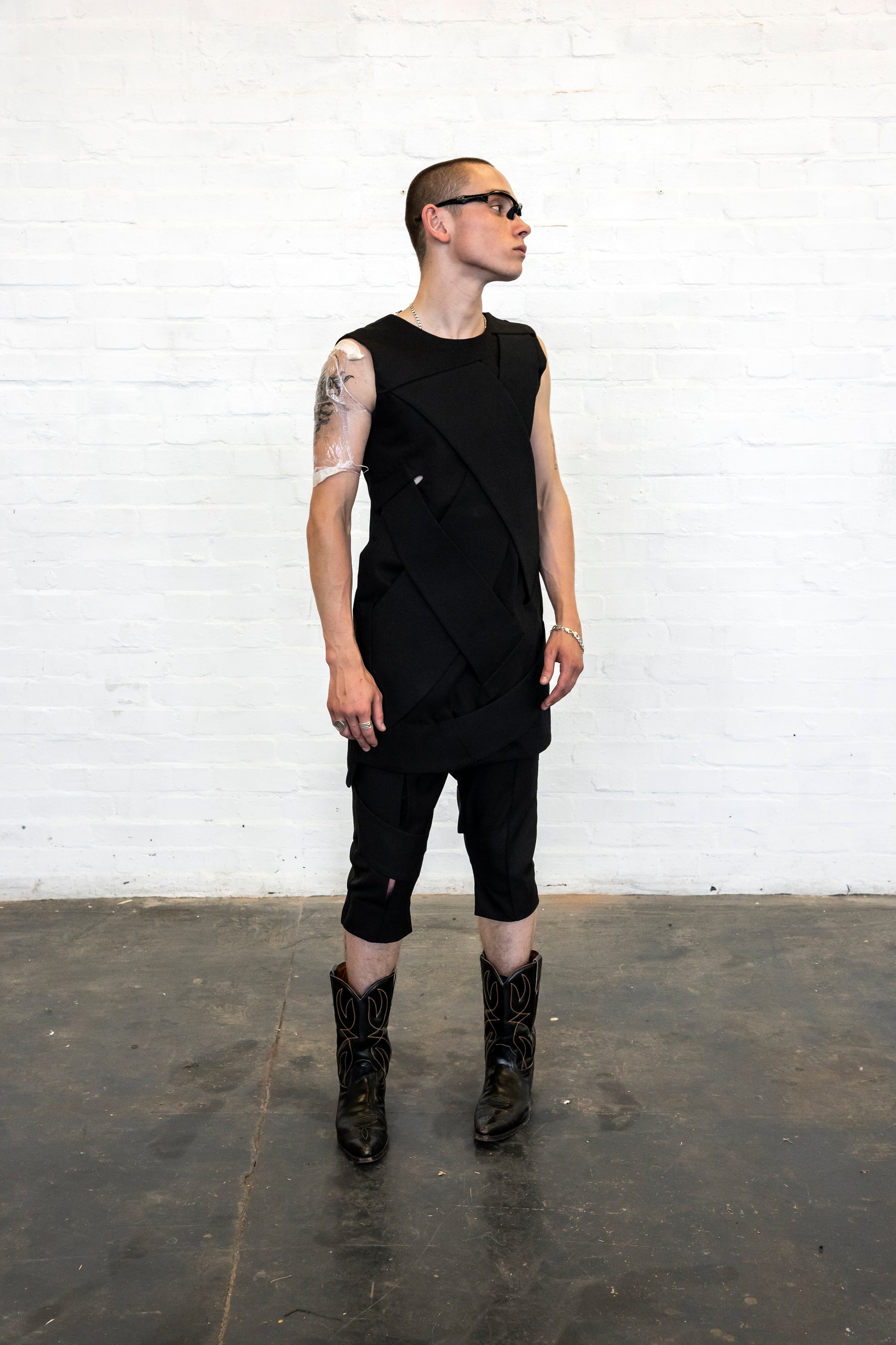 Sleeveless Black Denim Dress with Frontal Cross Panels