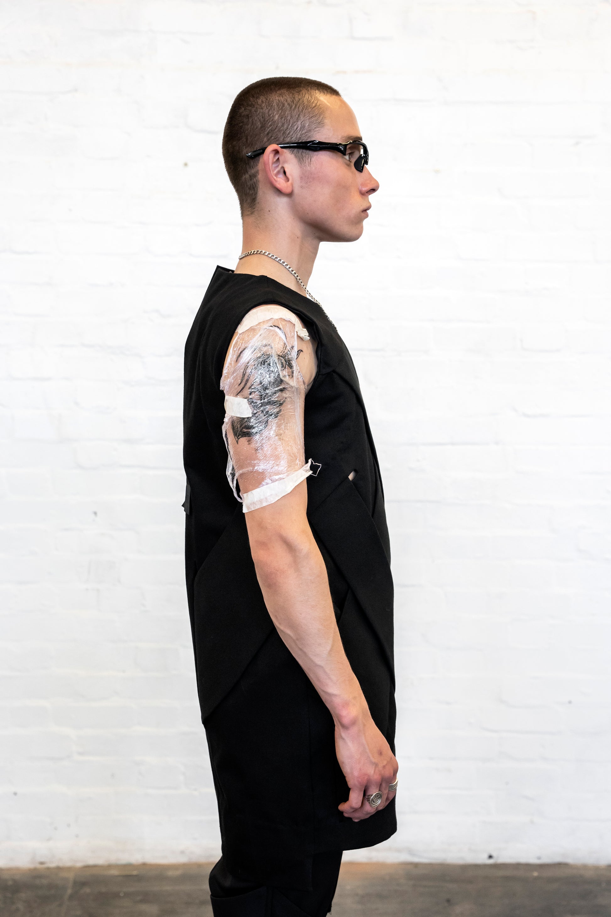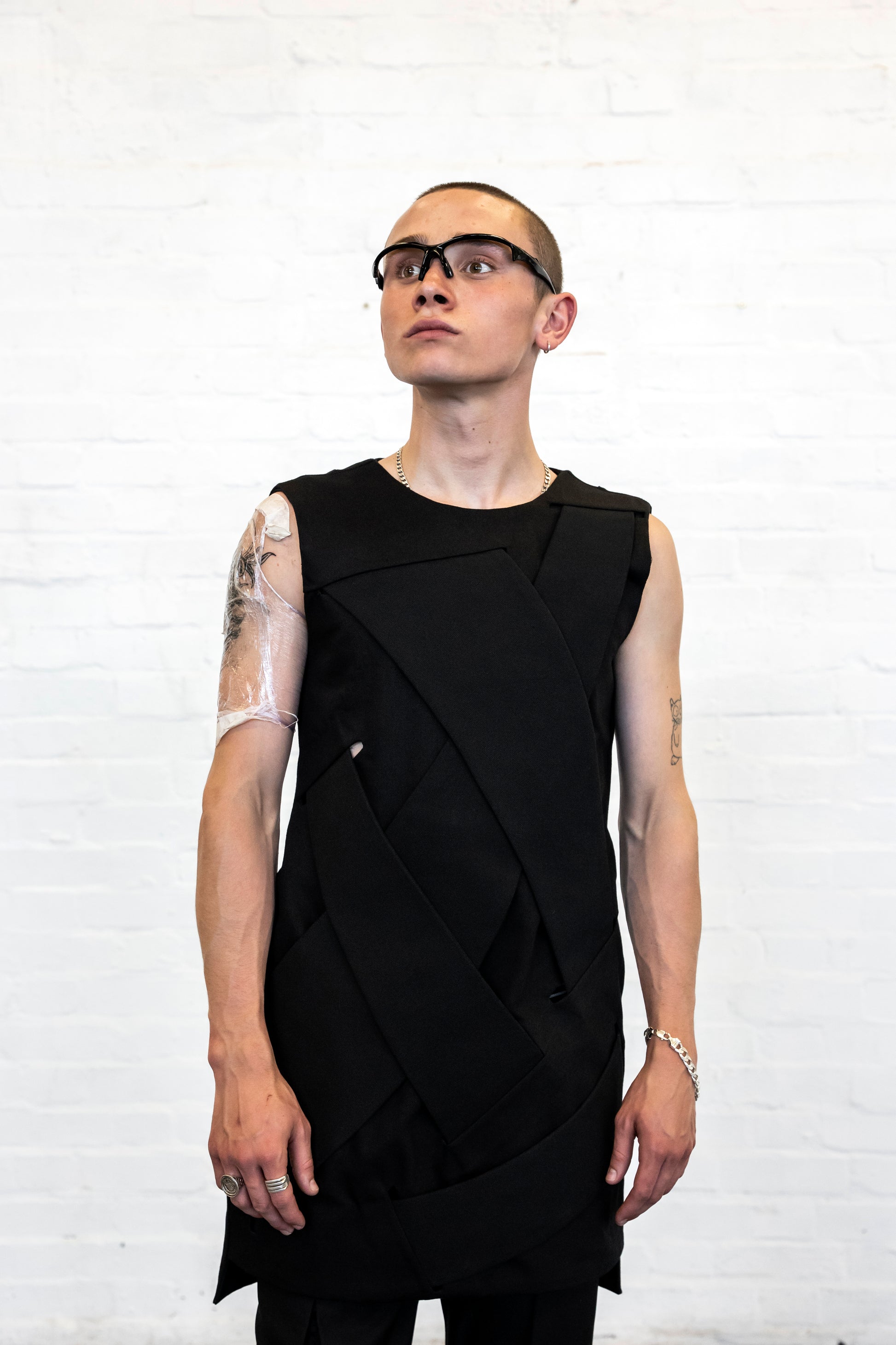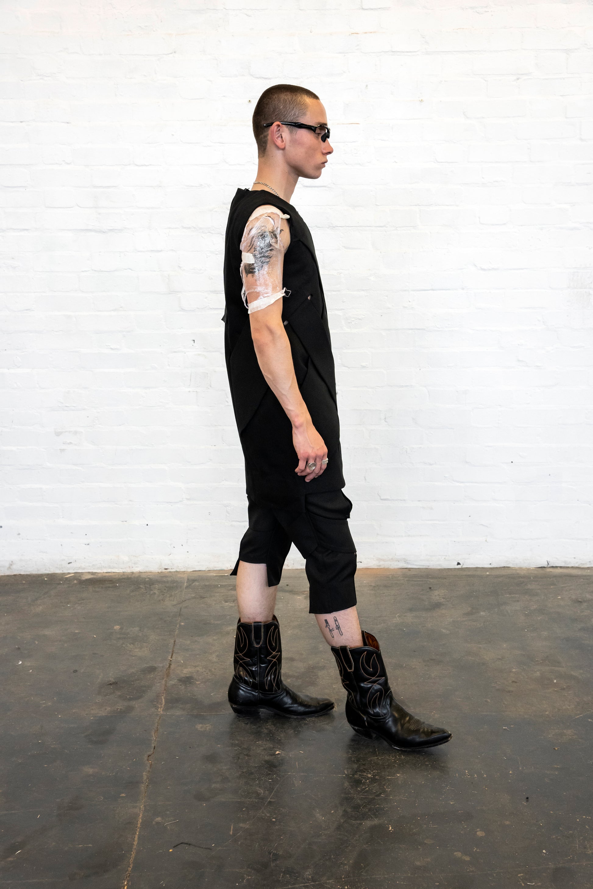 Sleeveless Black Denim Dress with Frontal Cross Panels