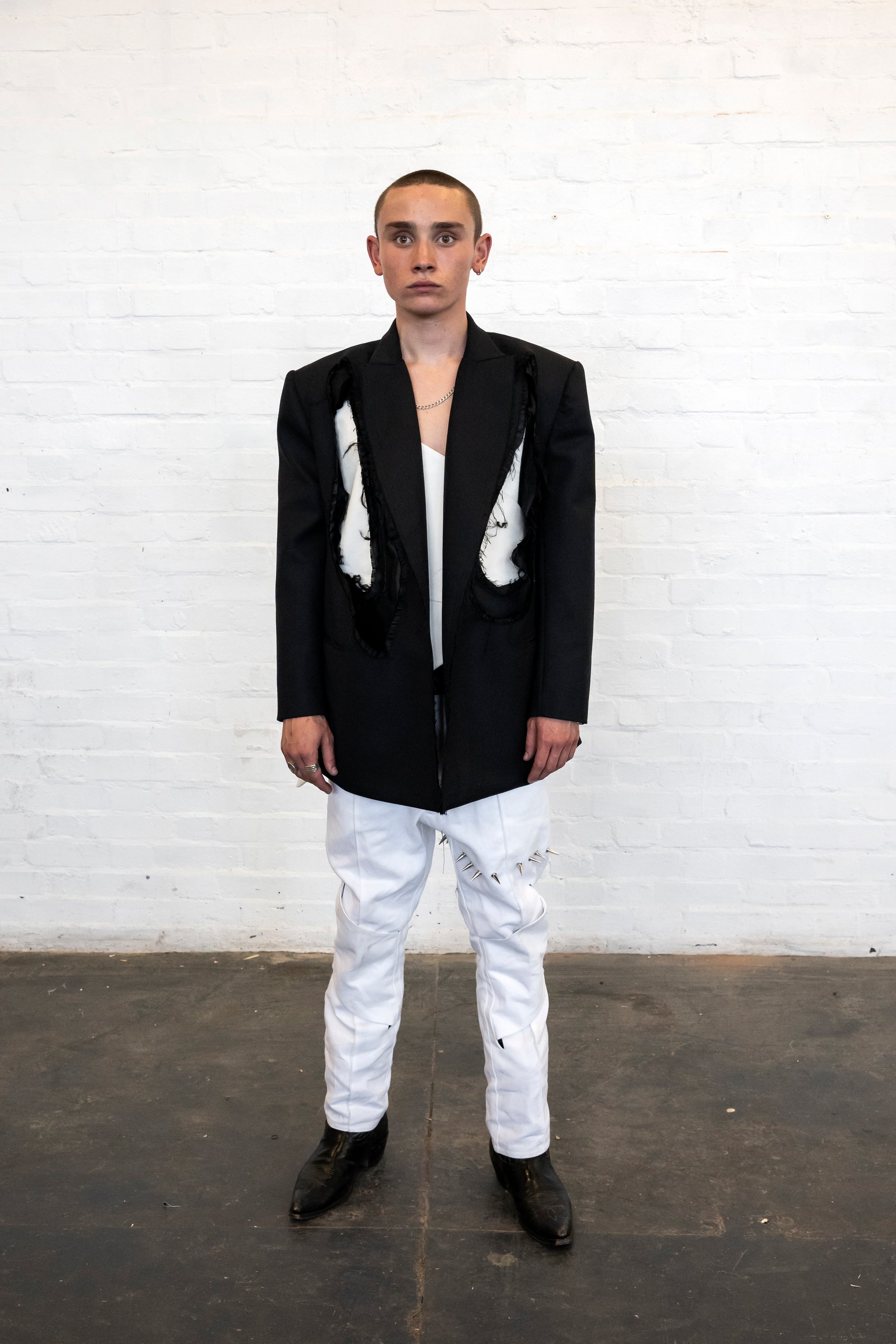 Single-breasted suit jacket crafted in a twill wool blend, detailed with a front and back cut outs and front pockets. Cut to a relaxed fit with dropped shoulders and below hip length