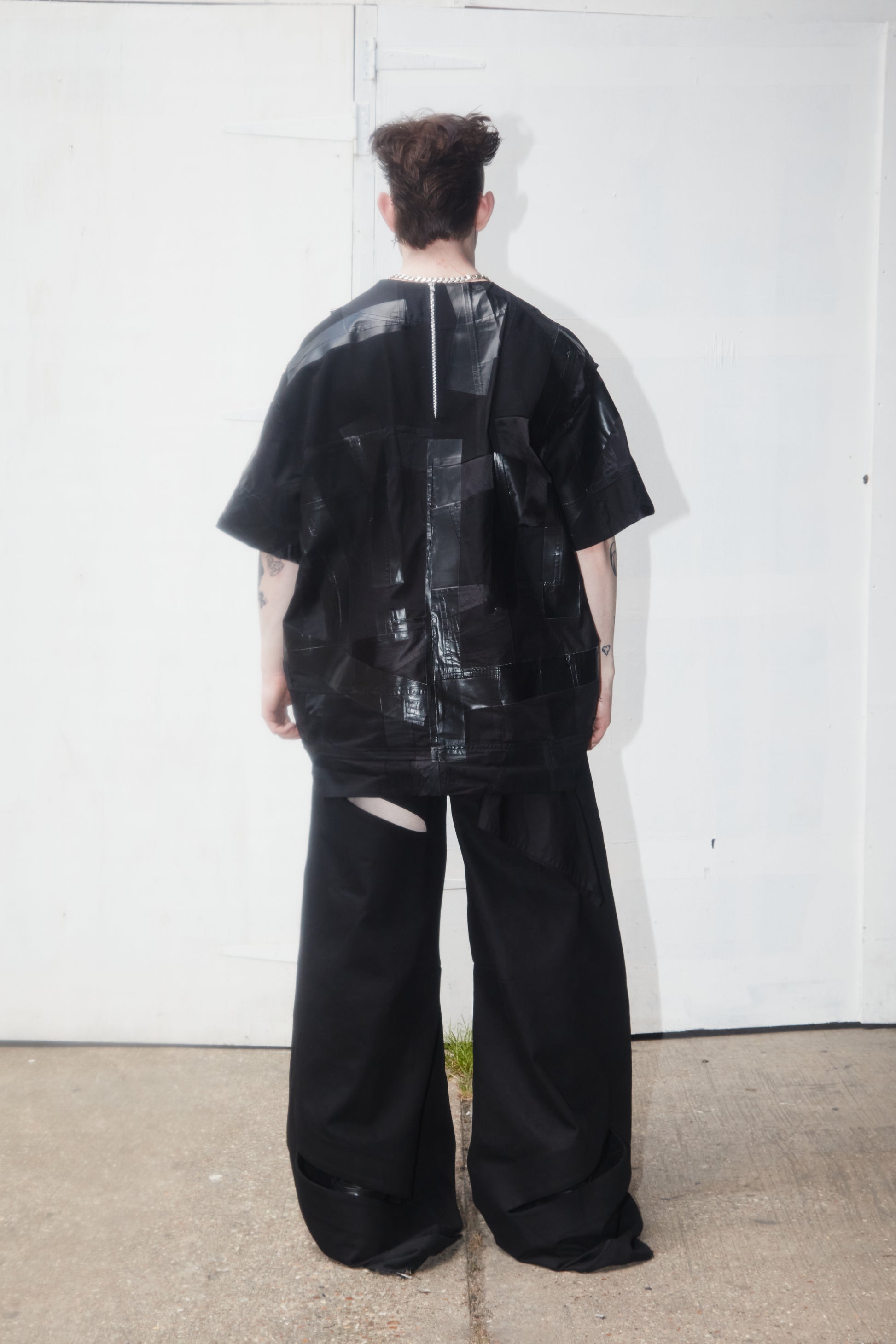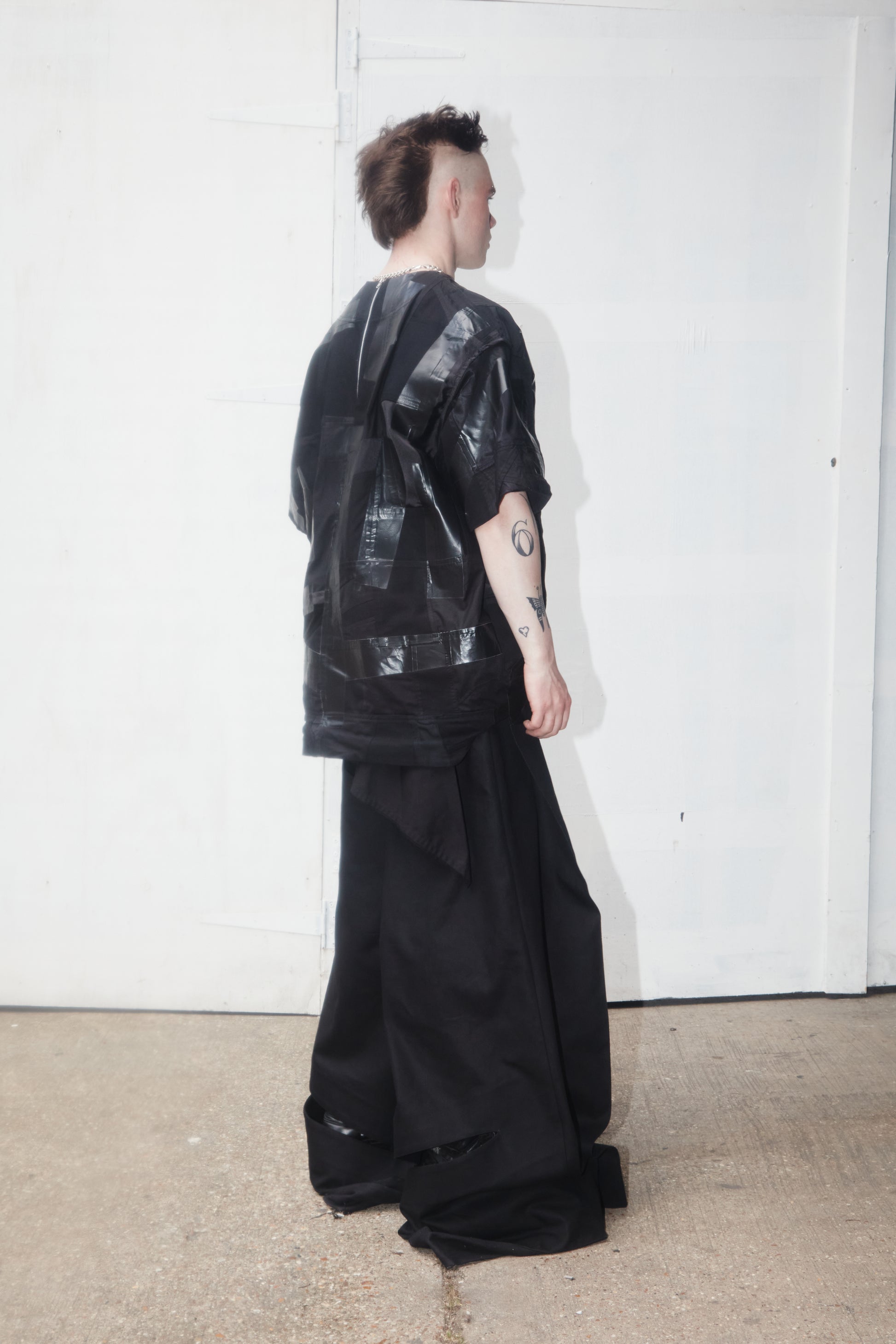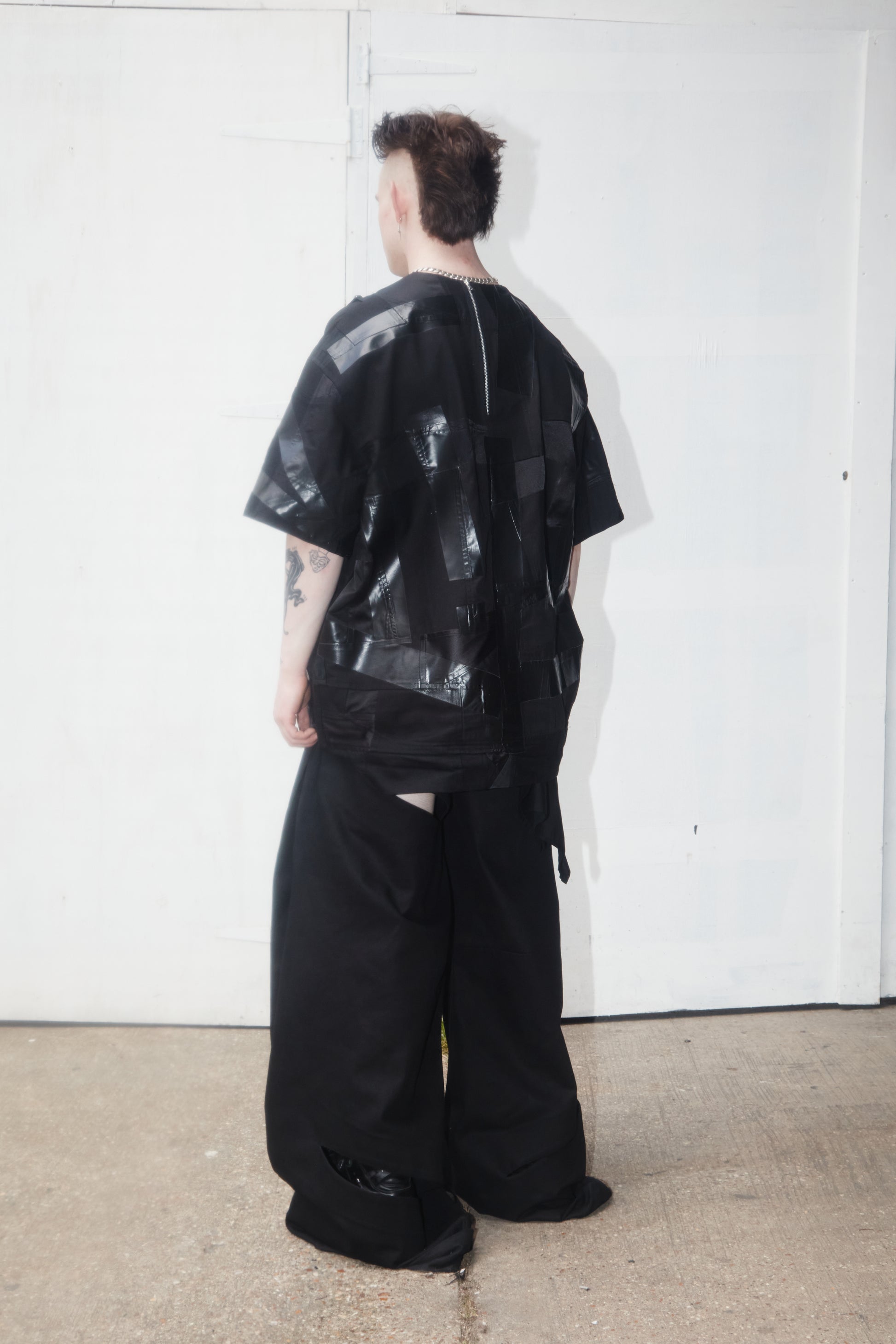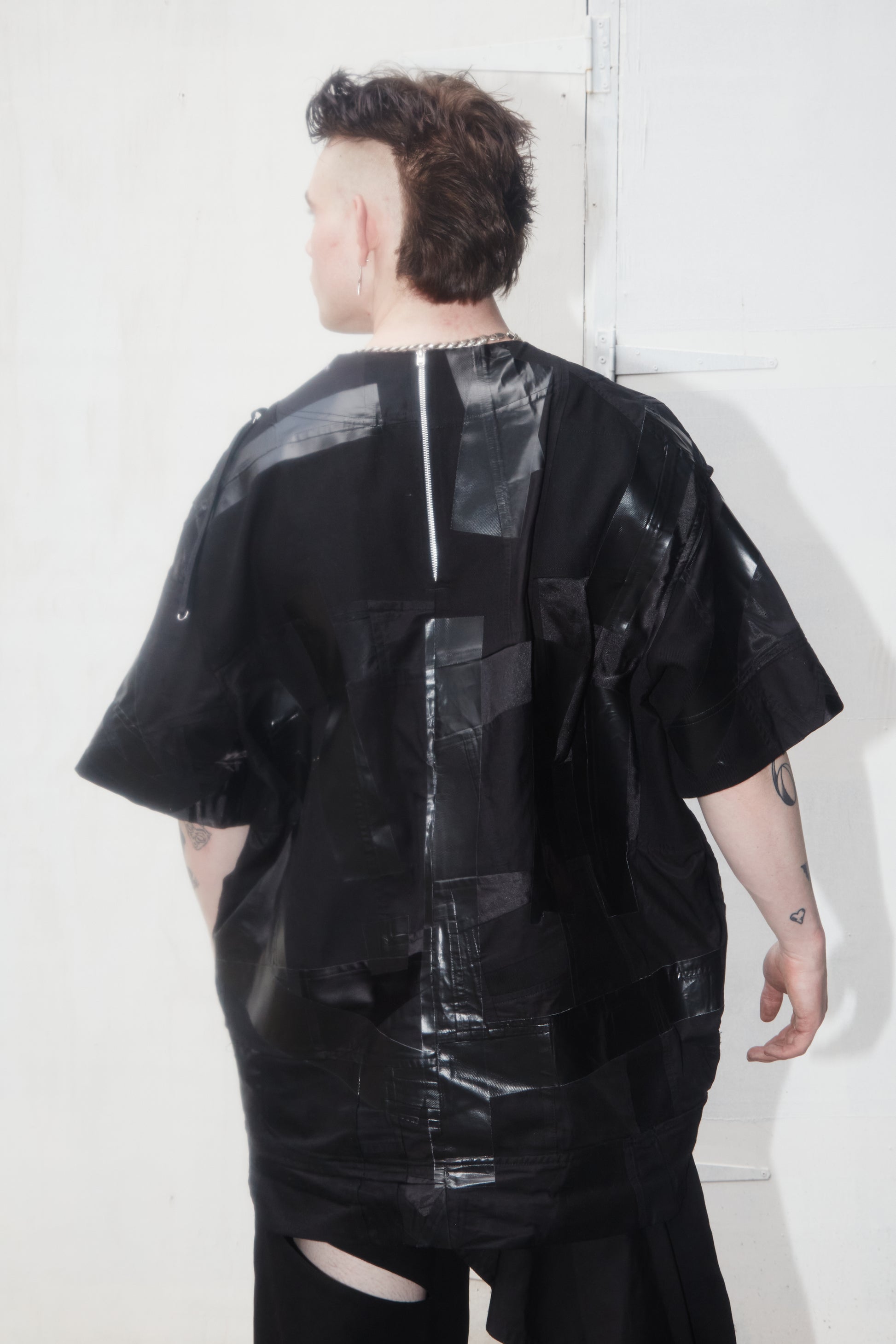 BLACK OVERSIZED TOP MADE OUT OF LEFTOVER FABRIC COVERED WITH FOIL STRIPES