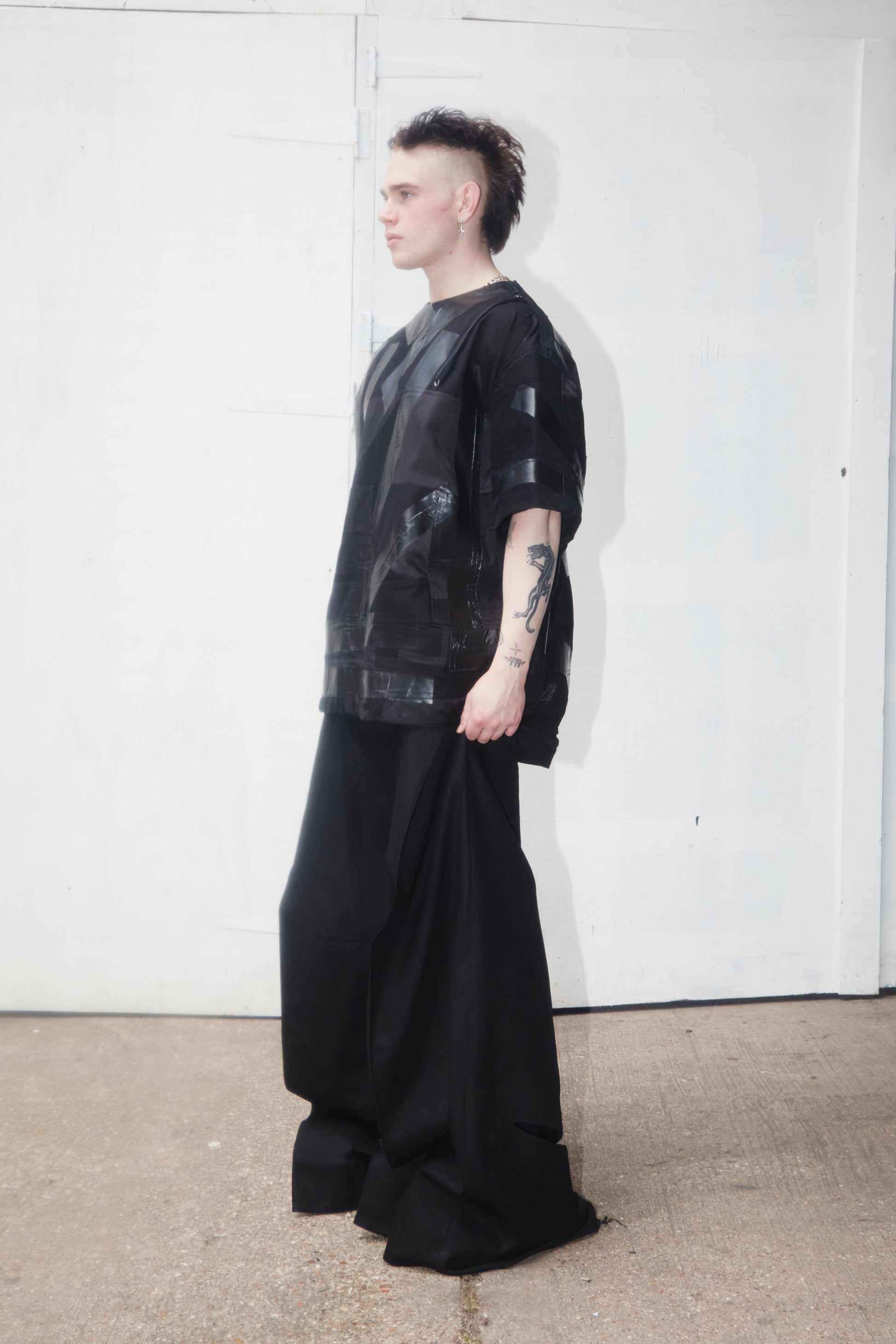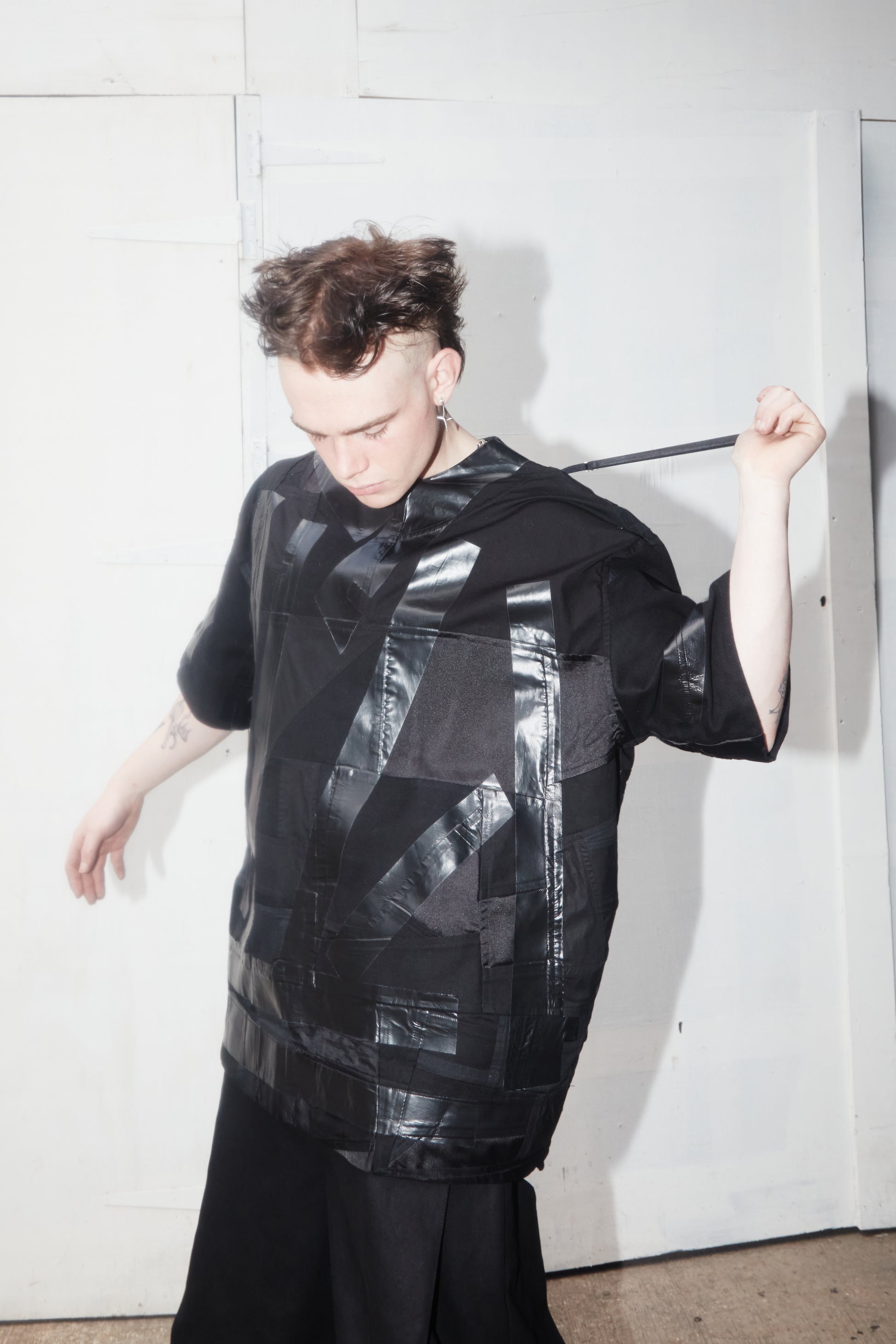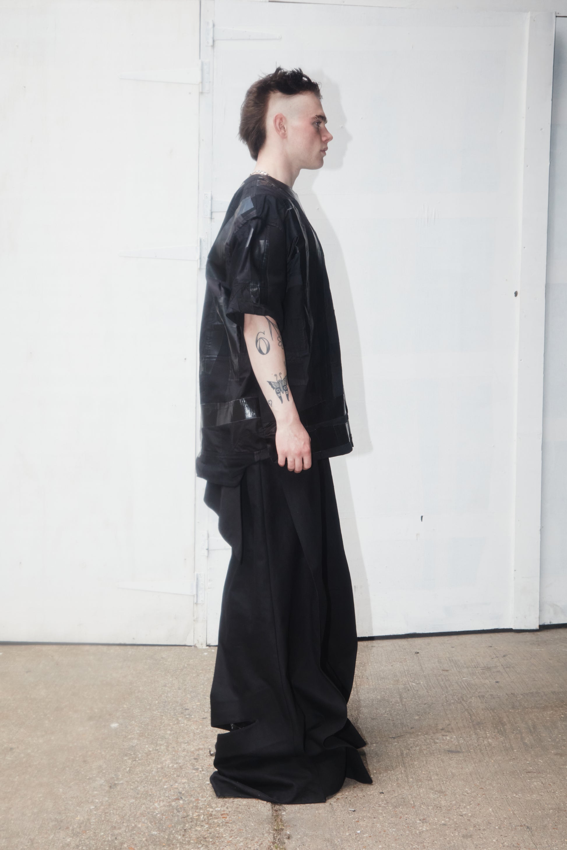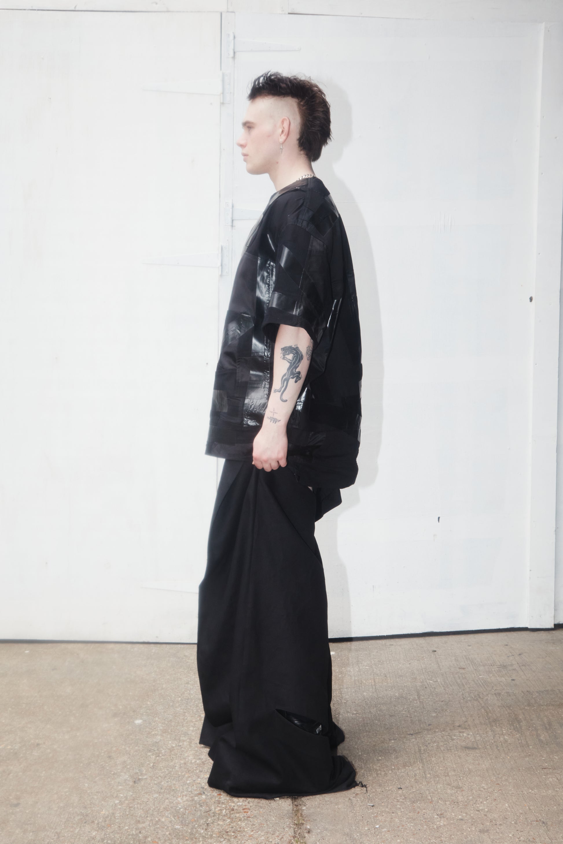 BLACK OVERSIZED TOP MADE OUT OF LEFTOVER FABRIC COVERED WITH FOIL STRIPES