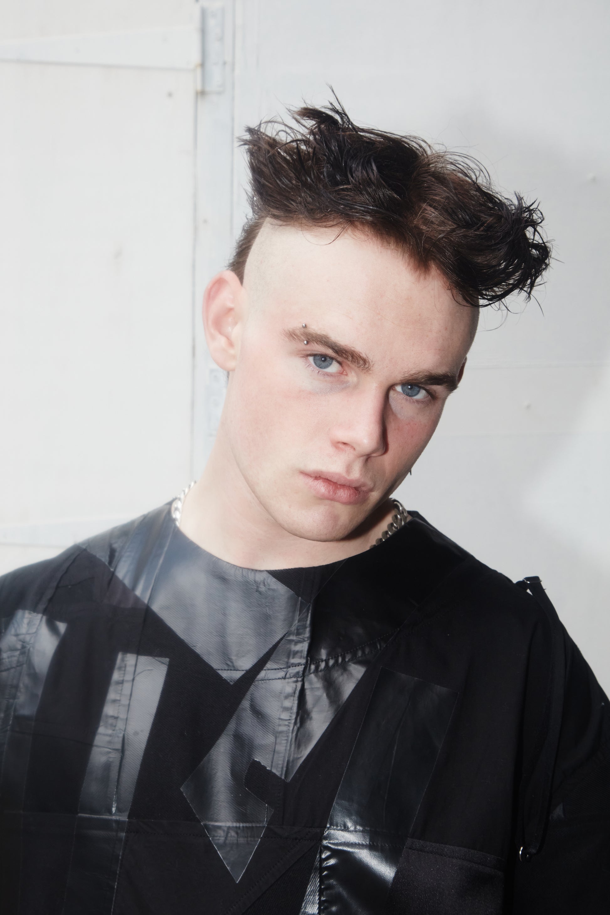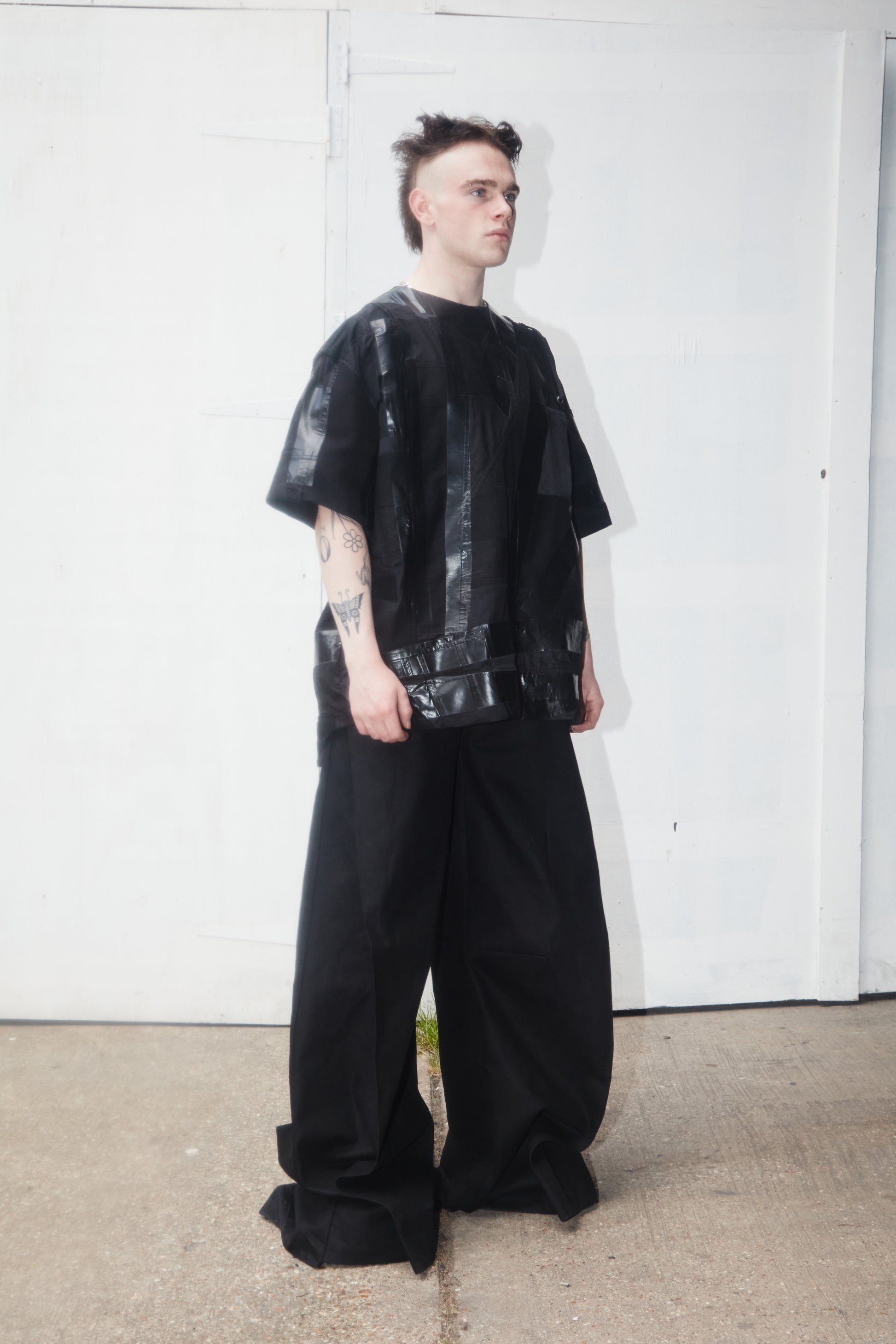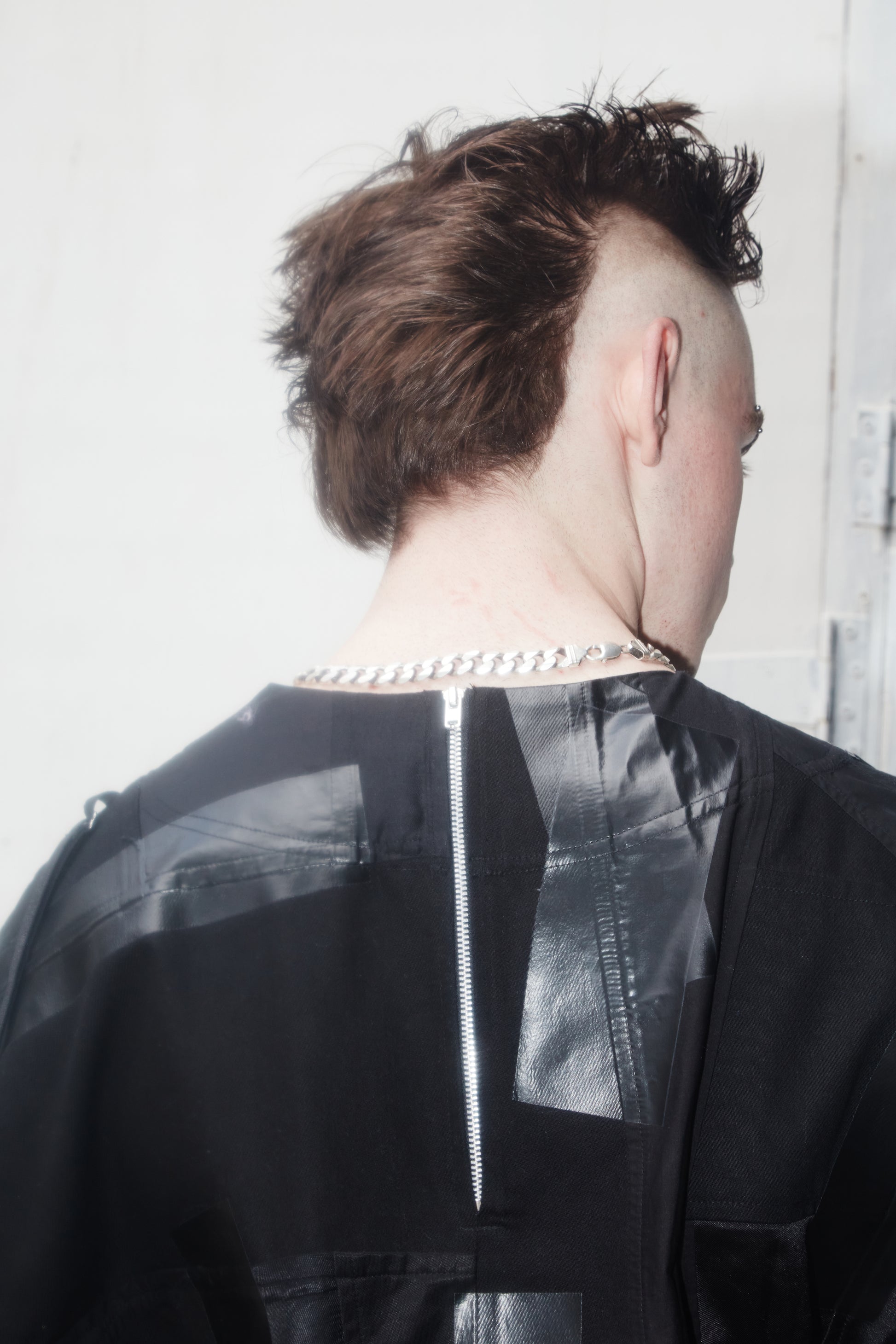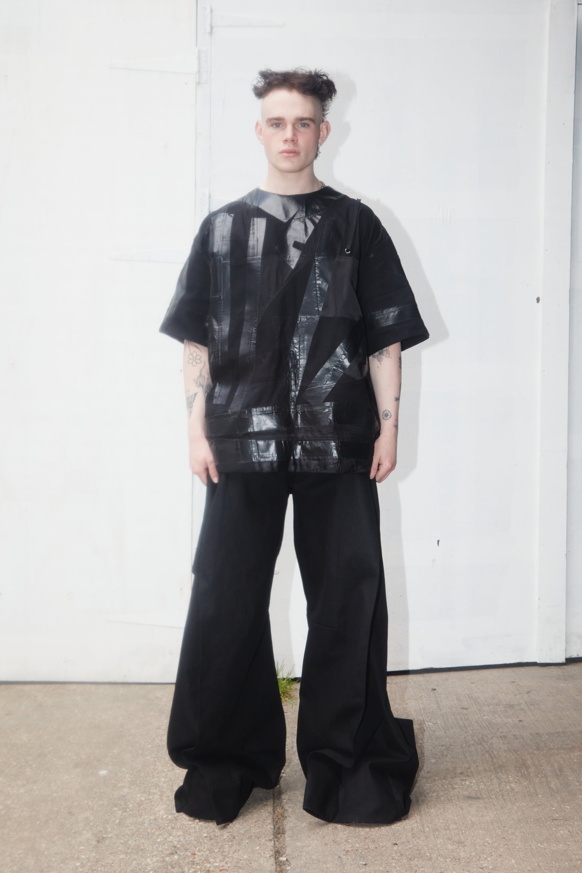 BLACK OVERSIZED TOP MADE OUT OF LEFTOVER FABRIC COVERED WITH FOIL STRIPES
