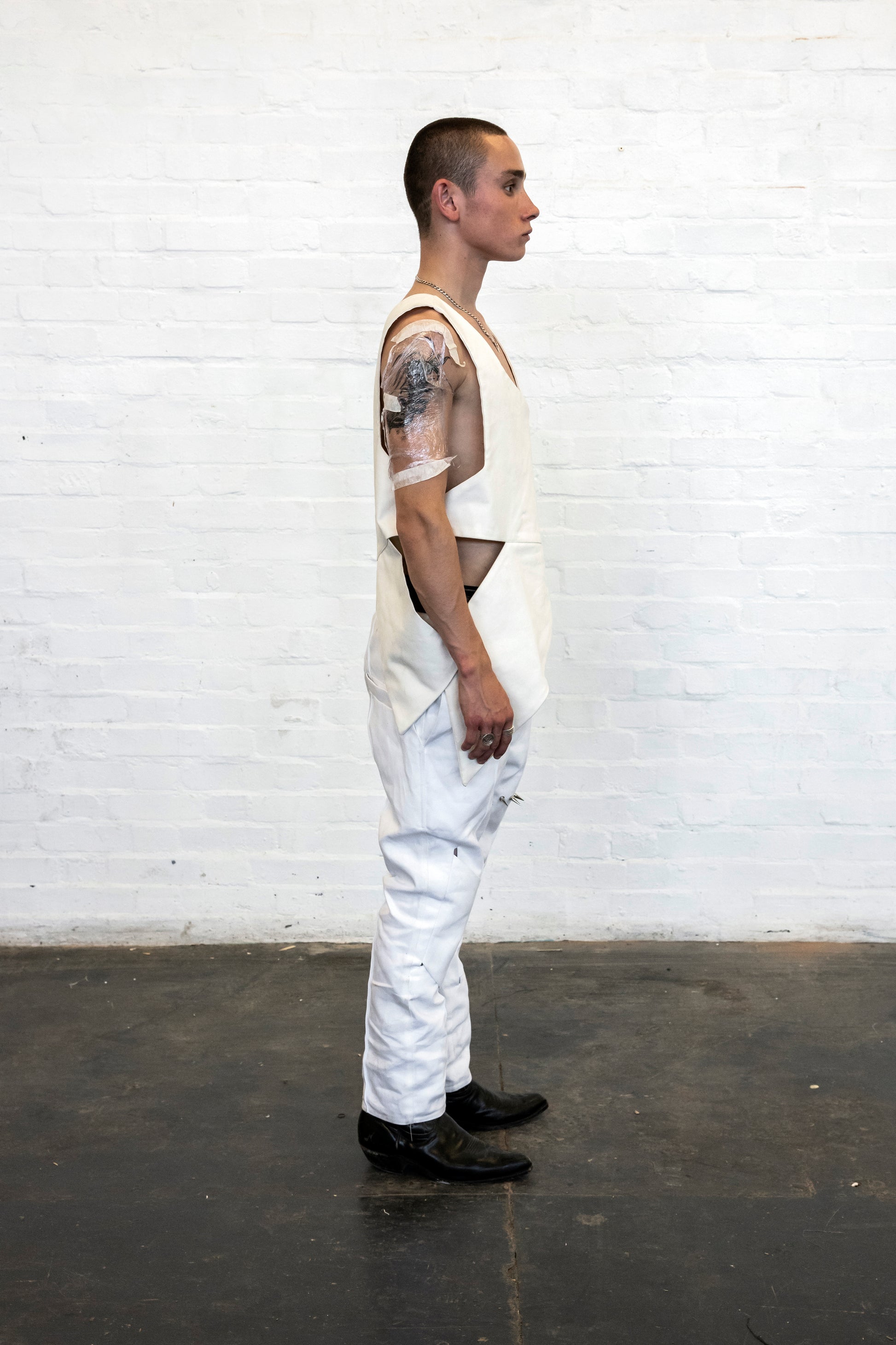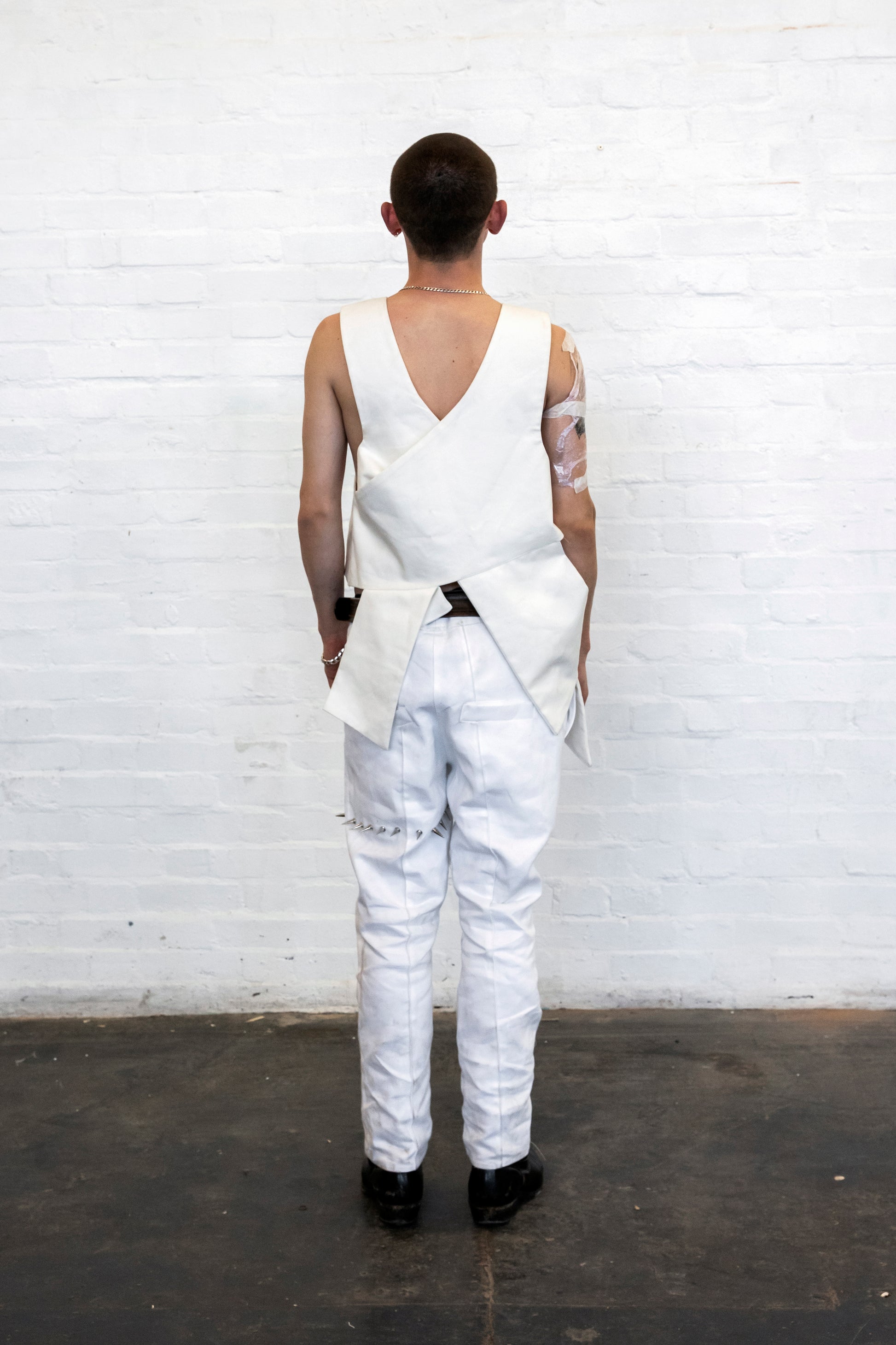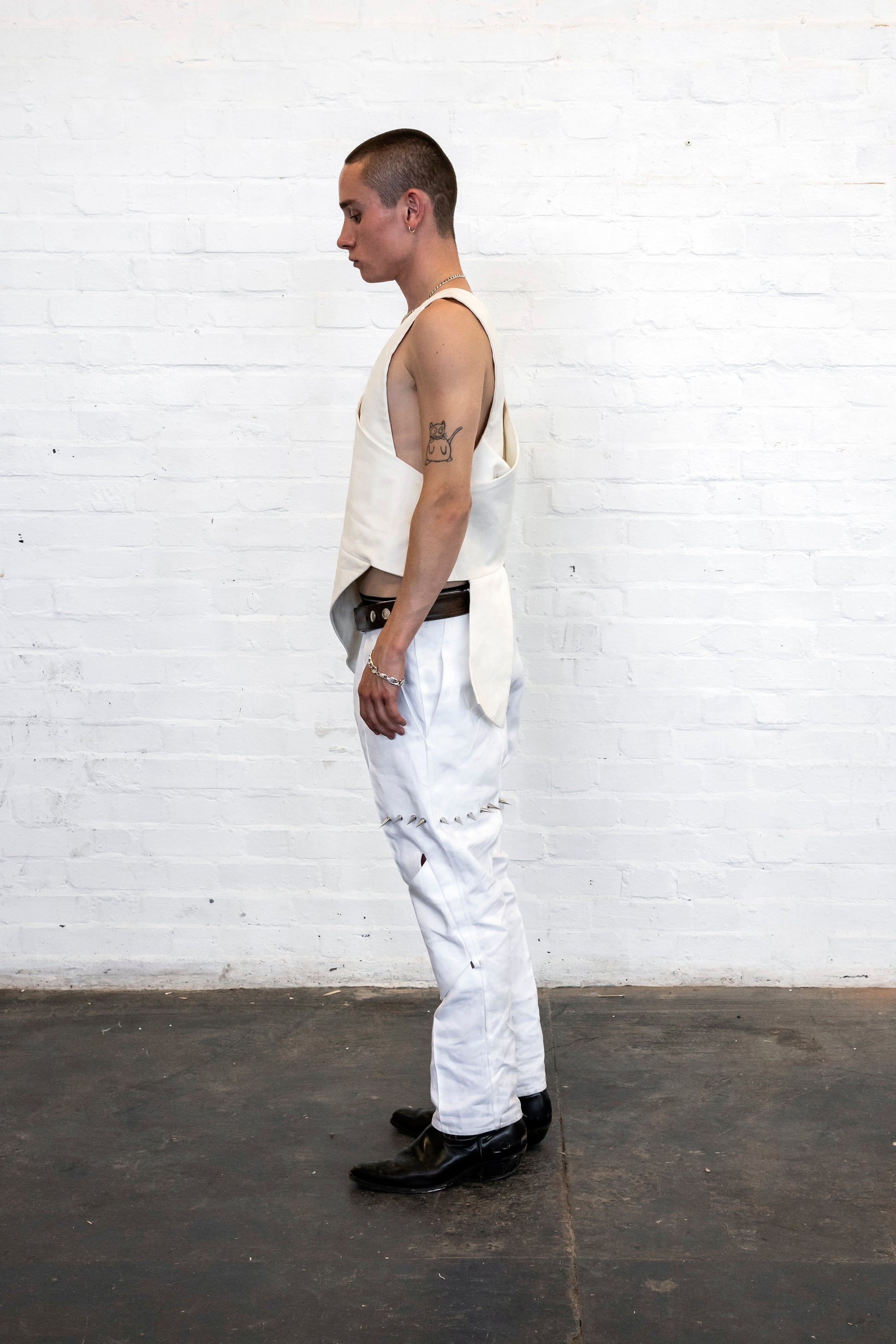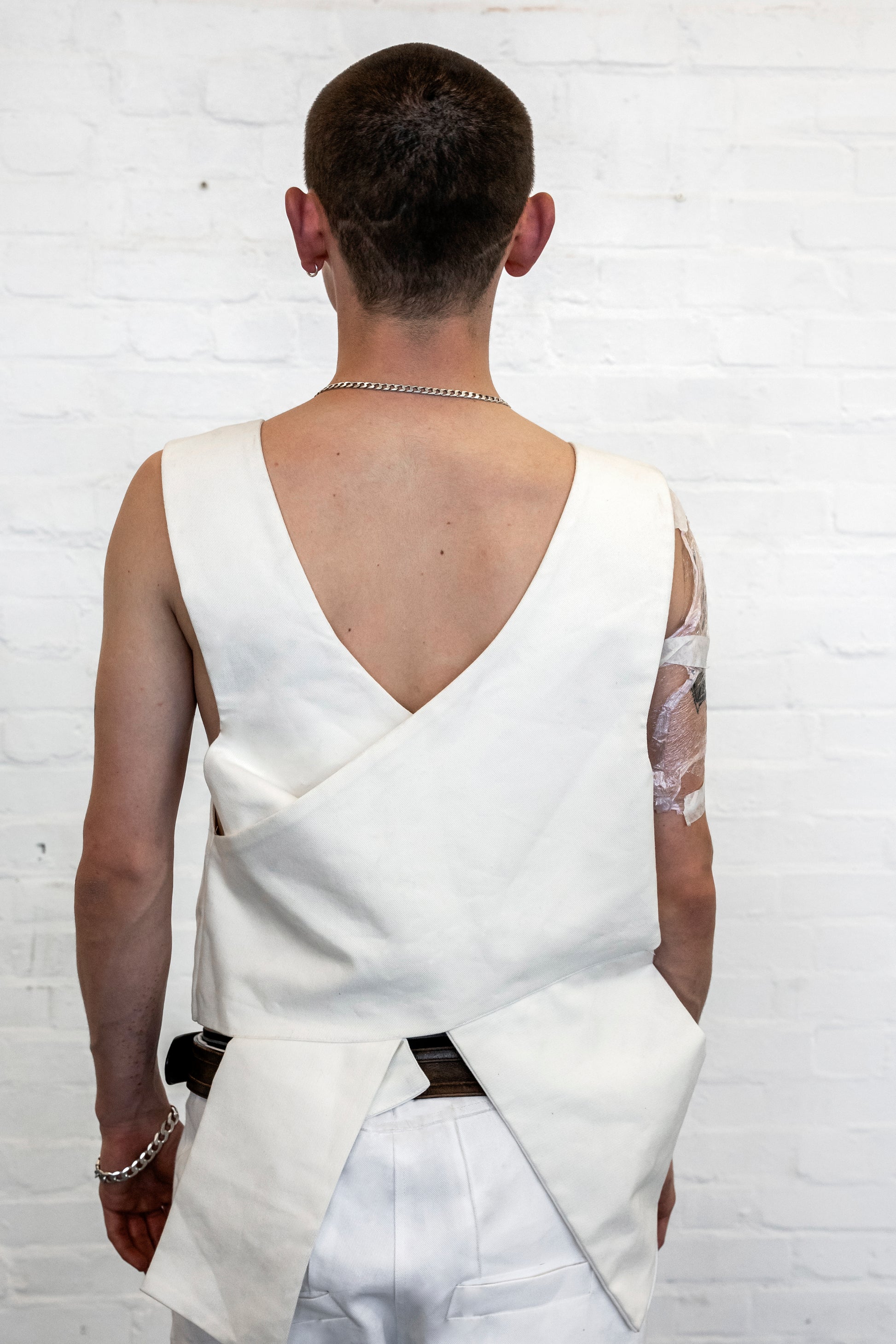 DECONSTRUCTED SLEEVELESS CUT OUT OFF WHITE DENIM TOP