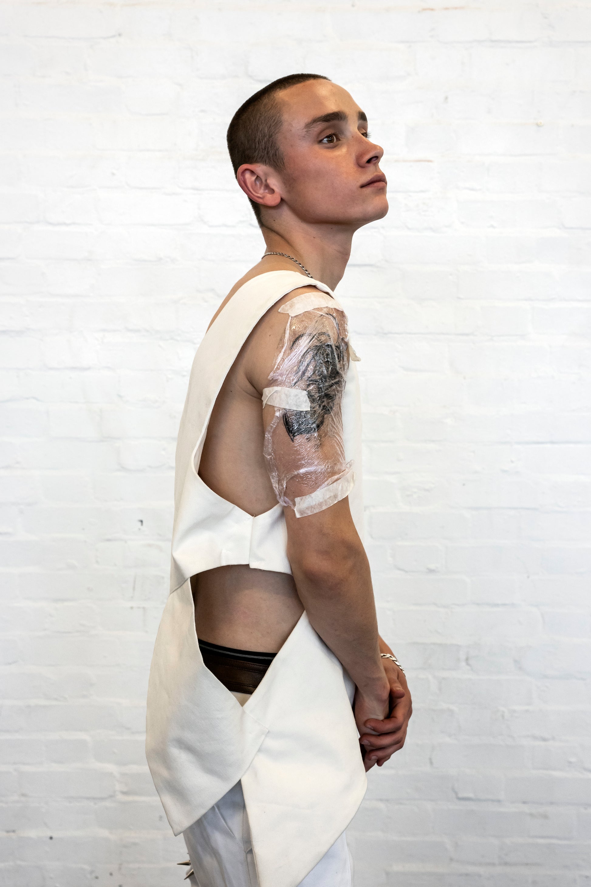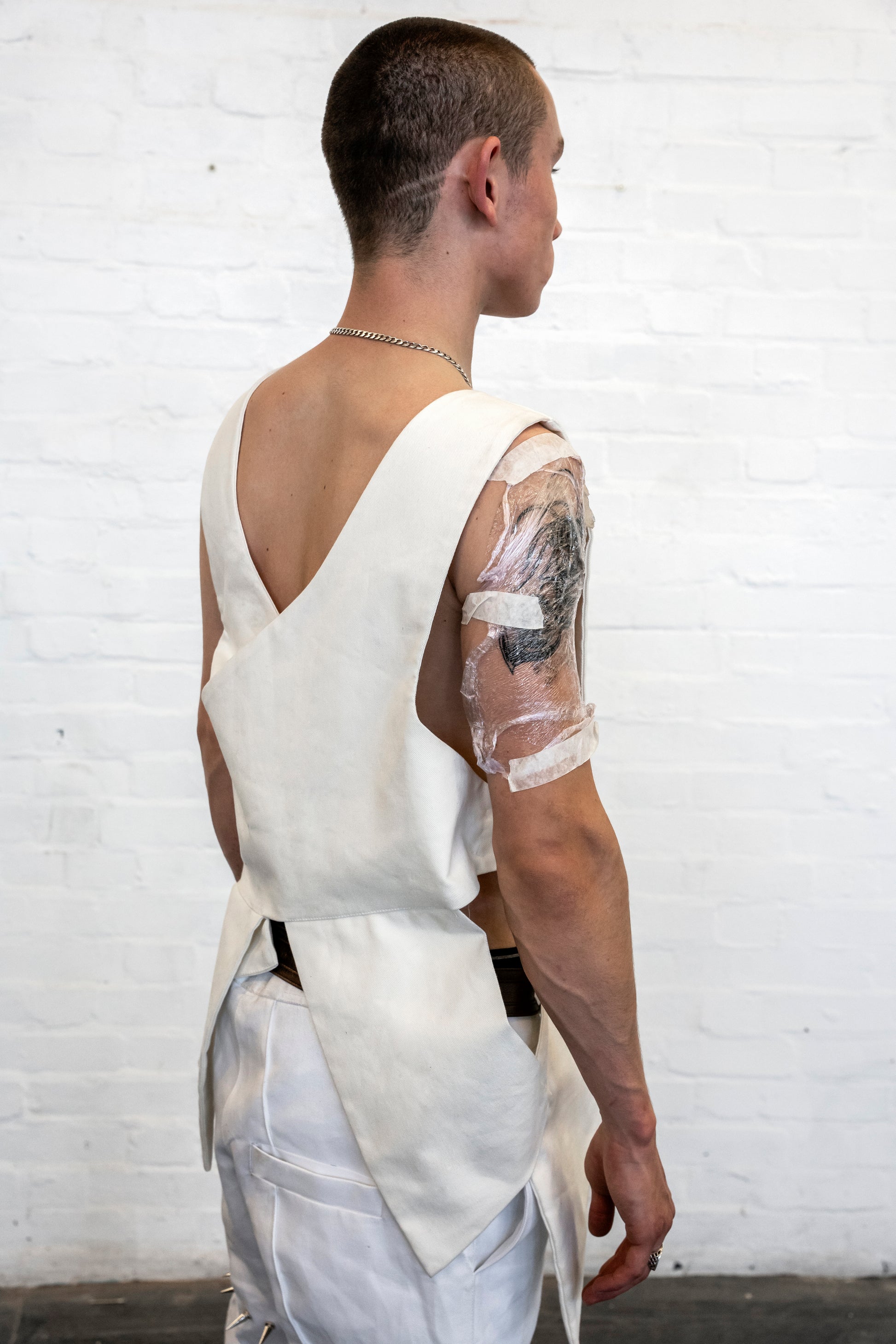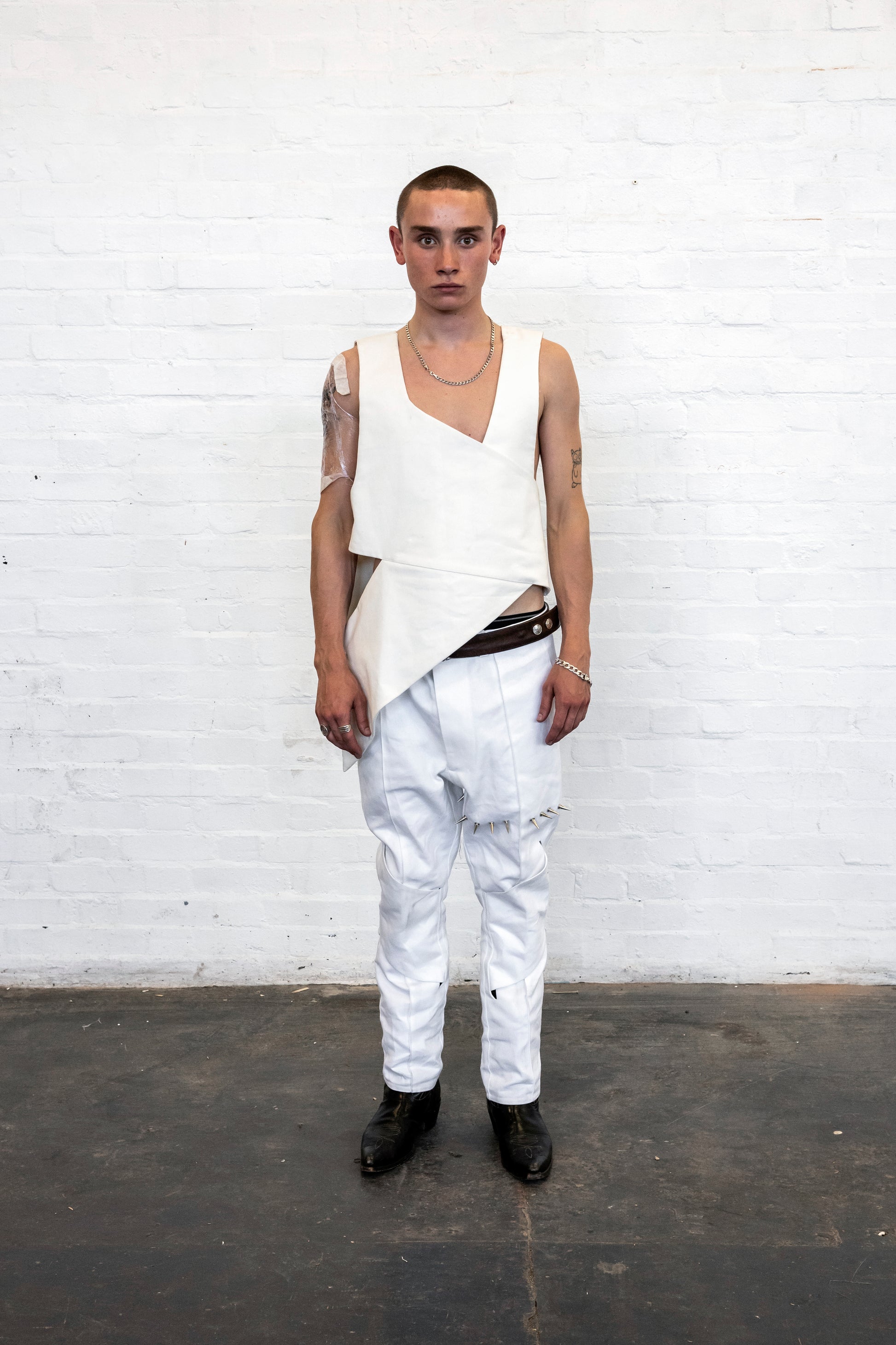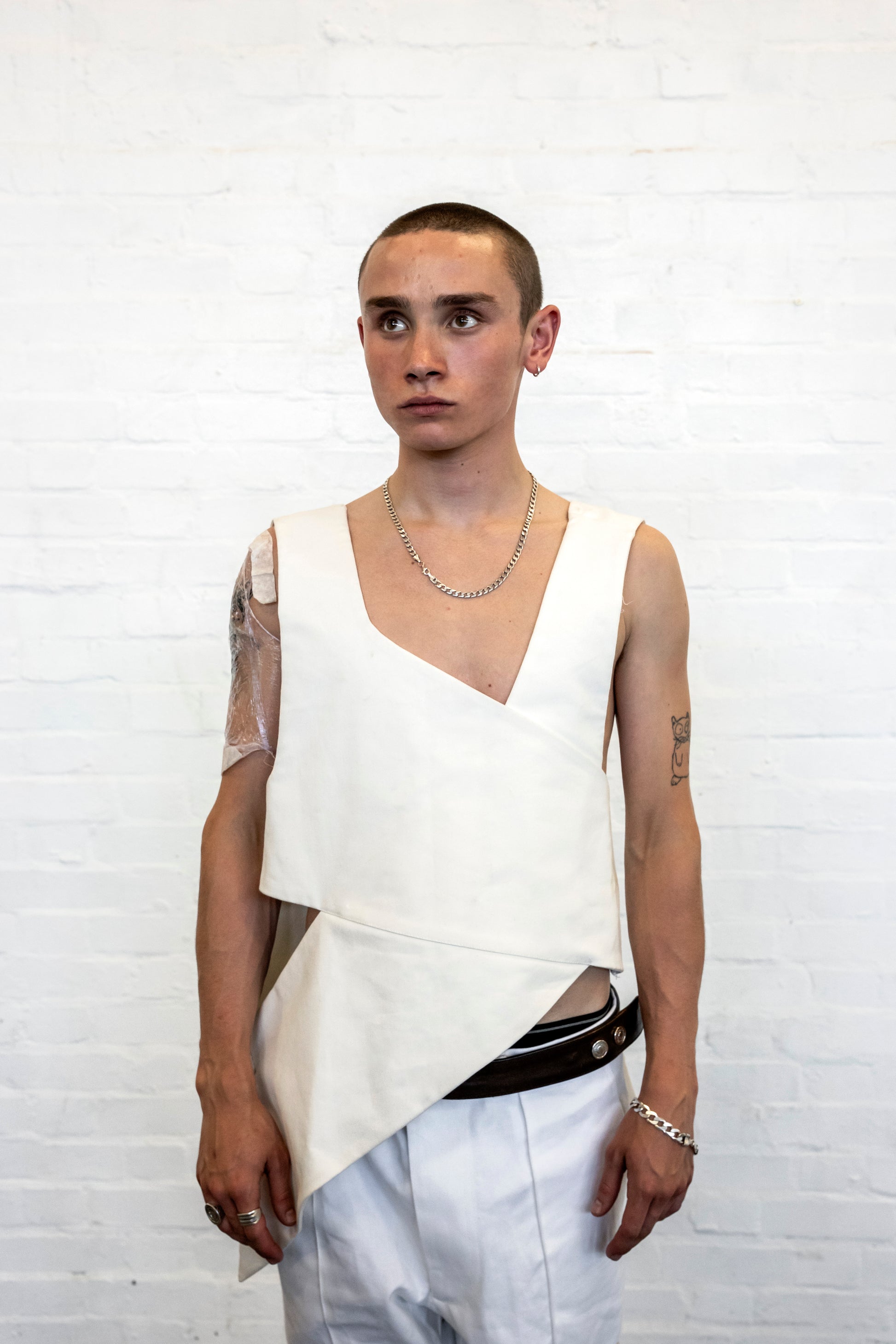 DECONSTRUCTED SLEEVELESS CUT OUT OFF WHITE DENIM TOP